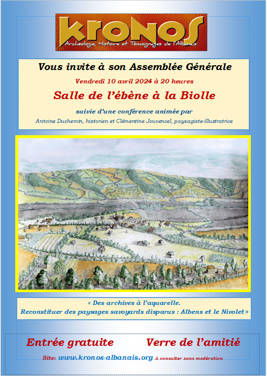 Cette Assemblée Générale sera suivie par une conférence animée par Antoine Duchemin, historien, et Clémentine Jouvencel, paysagiste-illustratrice, sur le thème «Des archives à l’aquarelle, reconstituer des paysages savoyard disparus : Albens et le Nivolet ».