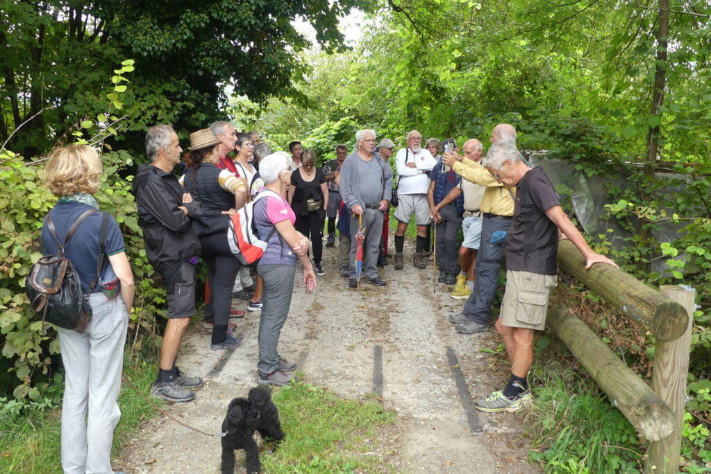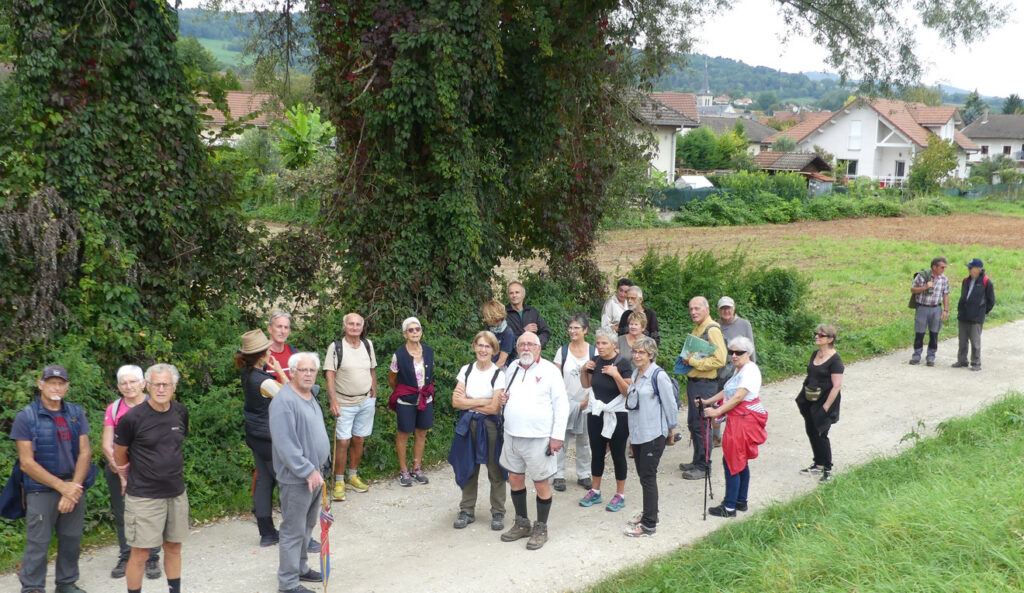 Nous prenons un petit temps d’échange au cours duquel Jean-François Braissand, maire d’Entrelacs, passe nous voir et nous souhaiter de belles découvertes. Malgré le temps maussade, nous voilà partis en direction de Marline et d’Orly par le « chemin sous-bois » qui longe la voie ferrée. Notre reporter photographe, Annie, en profite pour faire depuis le bord des voies un nouveau cliché de notre groupe.