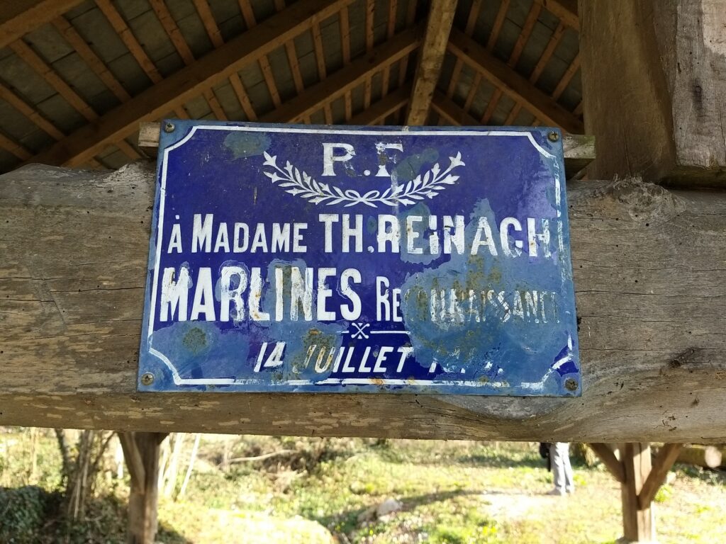 Un édifice public réalisé au début du XXème siècle grâce au concours de l’épouse du député de l’époque, Théodore Reinach. C’est ce que l’on peut lire sur une plaque émaillée, hélas un peu abîmée, visible sur une poutre de la toiture.